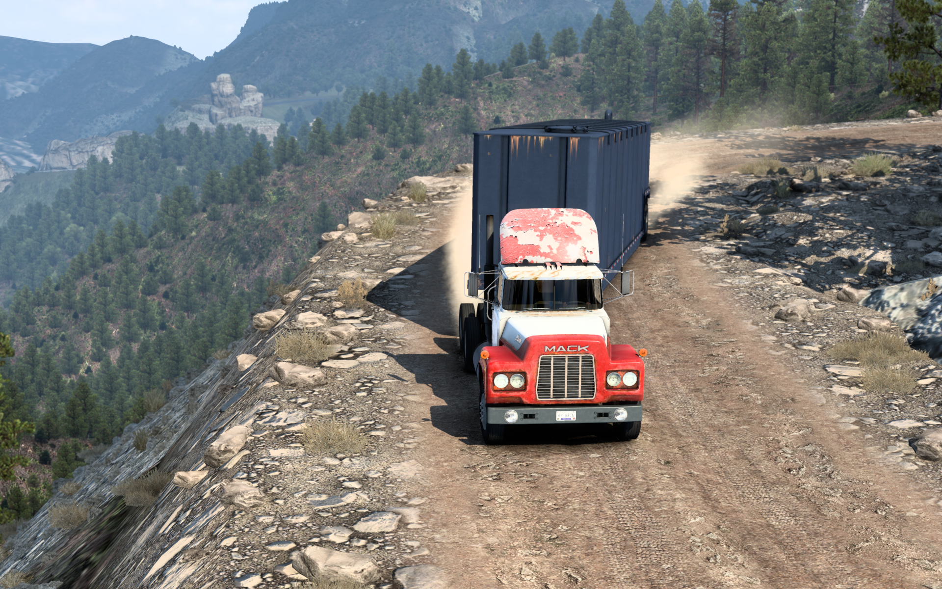 あとこんな道を走るのを想定していなかったせいか、AIのトラックが中々ファンキーな走りをしていたり。平野部は普通にハイウェーがあるのでこういうトラックでいいんですが、峠道はやや鼻先が短いマックRでもしんどいところがあったので、キャブオーバー型トラックの導入を考えたほうがいいかもしれないです。